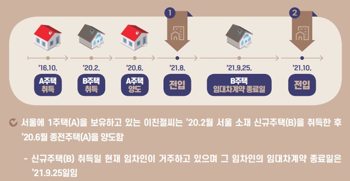 - 따라서, 임대차계약 종료일보다 늦게 이사·전입하면 일시적 2주택 비과세를 받을 수 없으니 주의하셔야 합니다. (위 2 의 경우)