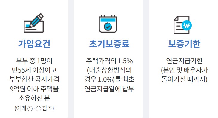 이미지 가입요건 부부 중 1명이 만55세 이상이고 부부합산 공시가격 9억원 이하 주택을 소유하신 분 (아래 ①~⑤ 참조) 초기보증료 주택가격의 1.5%(대출상환방식의 경우 1.0%)를 최초 연금지급일에
