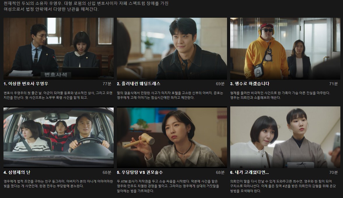 드라마 이상한 변호사 우영우는 총 16부작으로 구성되어 있으며 천재적인 두뇌와 자폐스펙트럼을 동시에 지니고 있는 신입 변호사 우영우의 대형 로펌 생존기입니다.